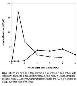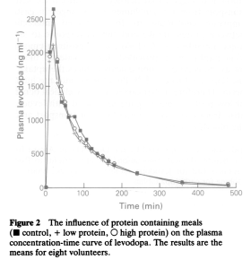 Longer answer: Patients are frequently counseled to avoid taking levodopa after protein-heavy meals, based on the theory that protein interferes with levodopa absorption in the digestive system. At a molecular level, levodopa is absorbed by a membrane transporter, LAT1, which is also used to take up hydrophobic amino acids, including tyrosine, which is chemically very similar to levodopa. So there is a plausible rationale for this advice, as well as several empirical studies with data suggesting protein intake can dramatically delay levodopa absorption, and somewhat reduce the total amount absorbed. A figure from one such study is shown below.